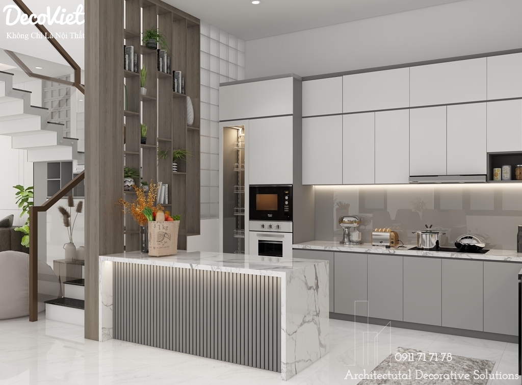 Sử dụng tủ bếp và thiết kế quầy bar mini mang đến sự hiện đại, sang trọng và đa chức năng.