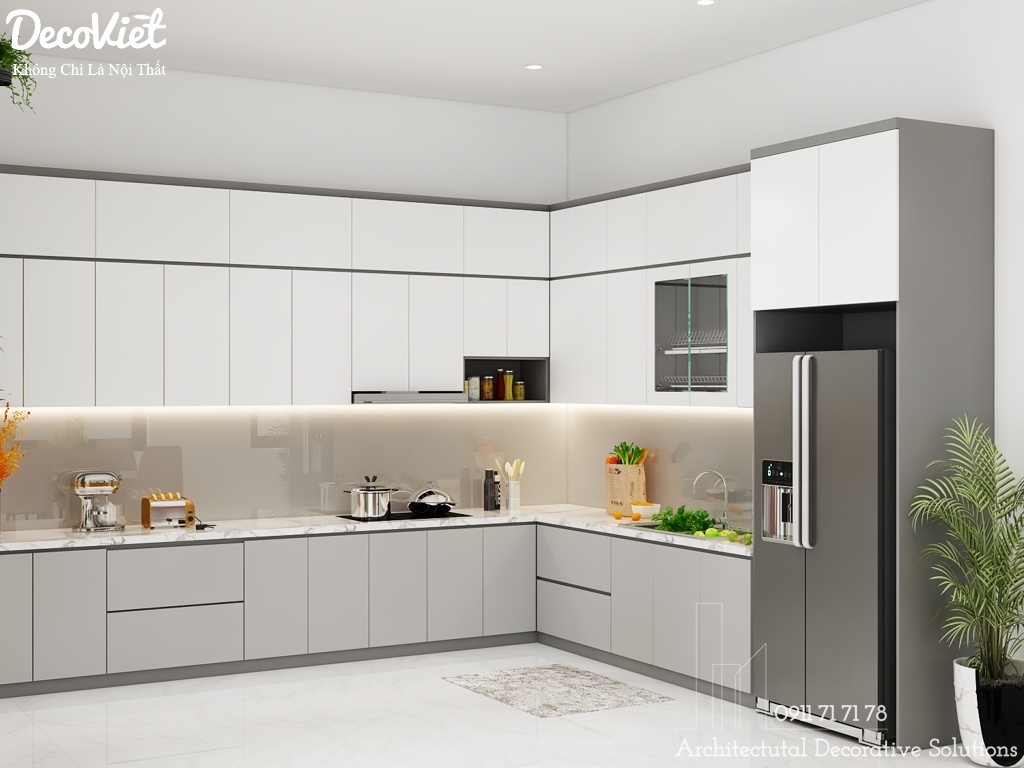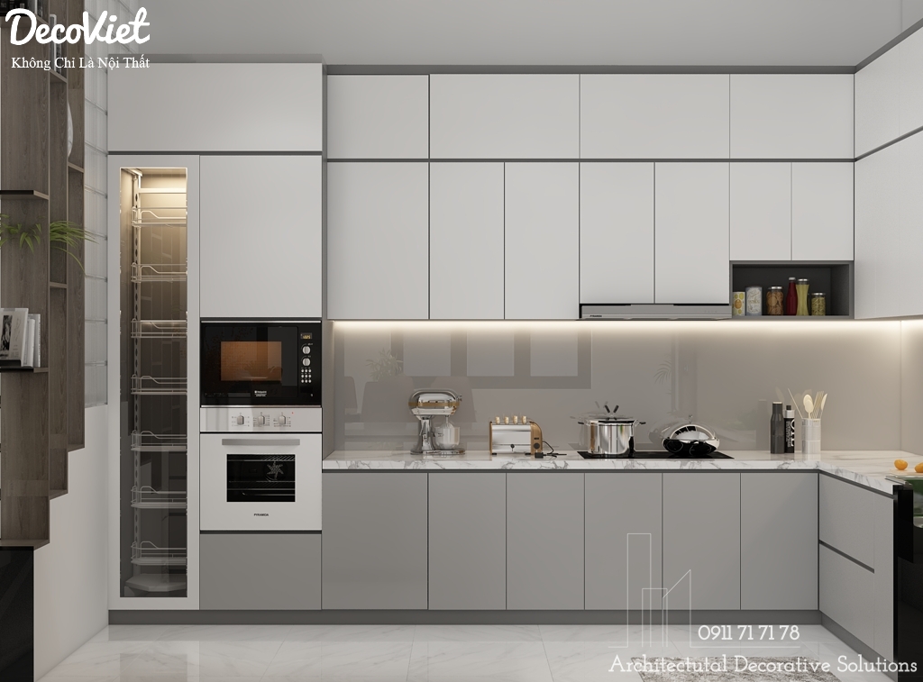 Hệ tủ bếp chữ L cao cấp với thiết kế đụng trần và có nhiều ngăn phân chia giúp tăng không gian lưu trữ một cách tối đa