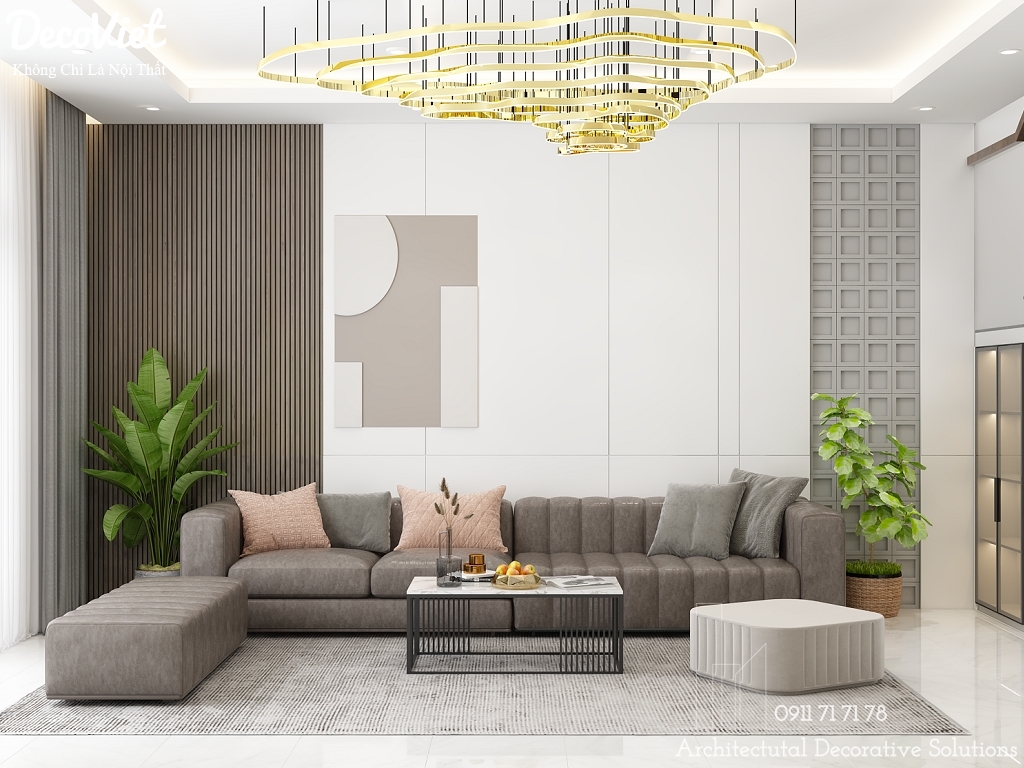 Bức tường trắng kết hợp hài hòa với ghế sofa gam màu nhẹ nhàng đem lại không gian phòng khách sự tinh tế và sang trọng.
