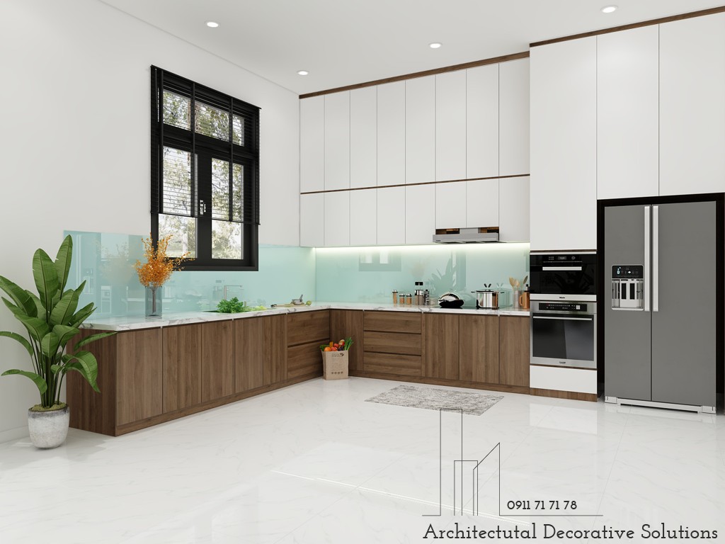 Sắc cam tạo một cảm giác dịu mắt và dễ nhìn nhưng vẫn tươi đẹp cho khoảng không phòng bếp. Màu cam được sử dụng cho phòng ăn,vì nó tươi mới và rực rỡ nên có tác dụng kích thích khẩu vị, tạo cảm giác thức ăn ngon hơn. Bên cạnh đó, màu cam là tông màu mạnh và nổi bật nên khi kết hợp với các màu nhẹ nhàng như trắng của hệ tủ bếp sẽ tạo sự tương phản nổi bật và cân bằng thị giác hơn.