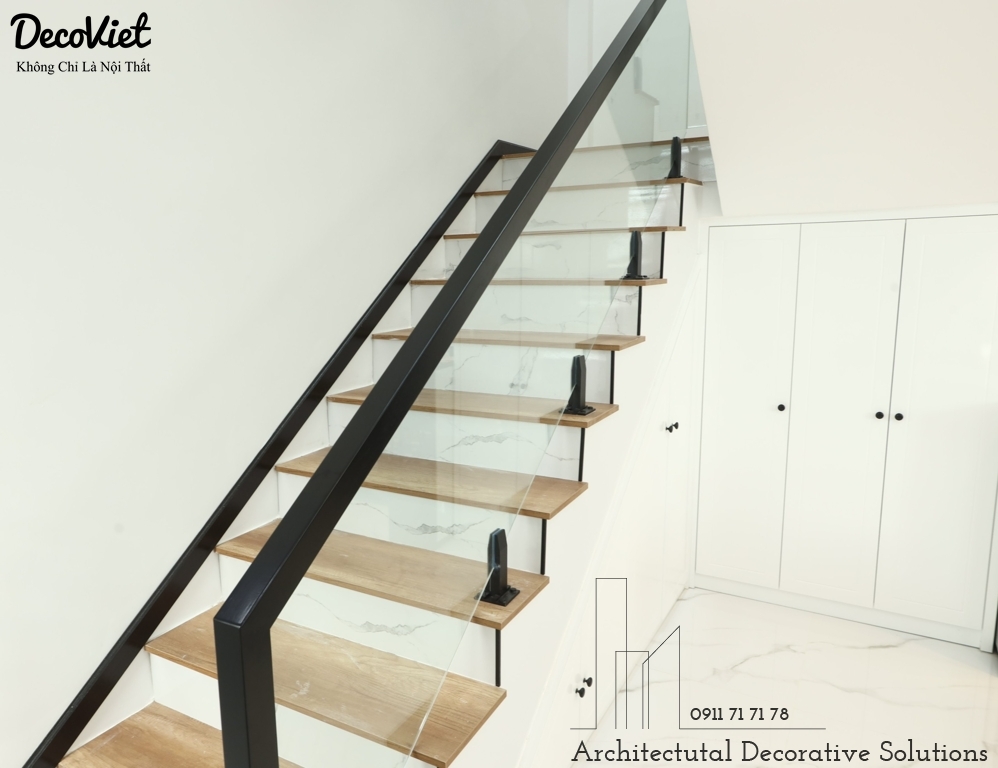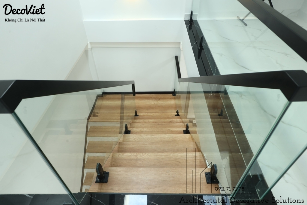 Sử dụng cầu thang làm bằng kính cường lực có thiết kế sang trọng cùng độ bền cao mang đến sự hiện đại, trẻ trung và ấn tượng cho không gian.