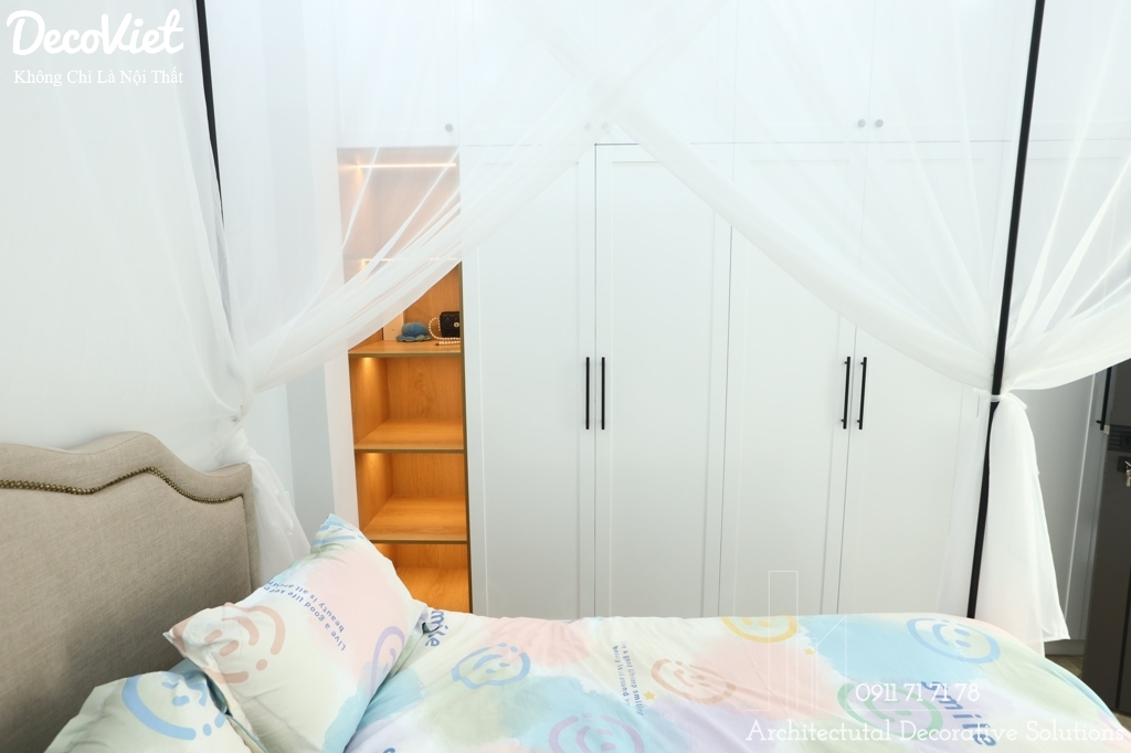 Phòng được thiết kế đầy đủ công năng sử dụng như: giường, tủ, bàn trang điểm và kệ để đồ cho gia chủ. Thiết kế tủ quần áo kịch trần với tông màu trắng hiện đại, tinh tế.