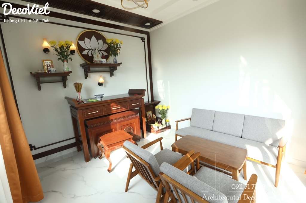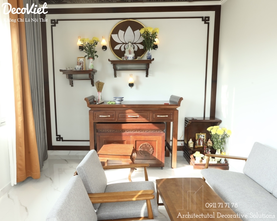 Phòng thờ nằm tại vị trí khá sang trọng và yên tĩnh. Để thể hiện lòng tôn kính với tổ tiên nên nơi đây cần phải trang trí gọn gàng và trang trọng. Đường nét, màu sắc và hoa văn của tủ thờ được thiết kế khéo léo, tỉ mỉ và vô cùng tinh xảo. Điều này cho thấy gia chủ là người chu đáo, thể hiện sự tâm linh và trang trọng.