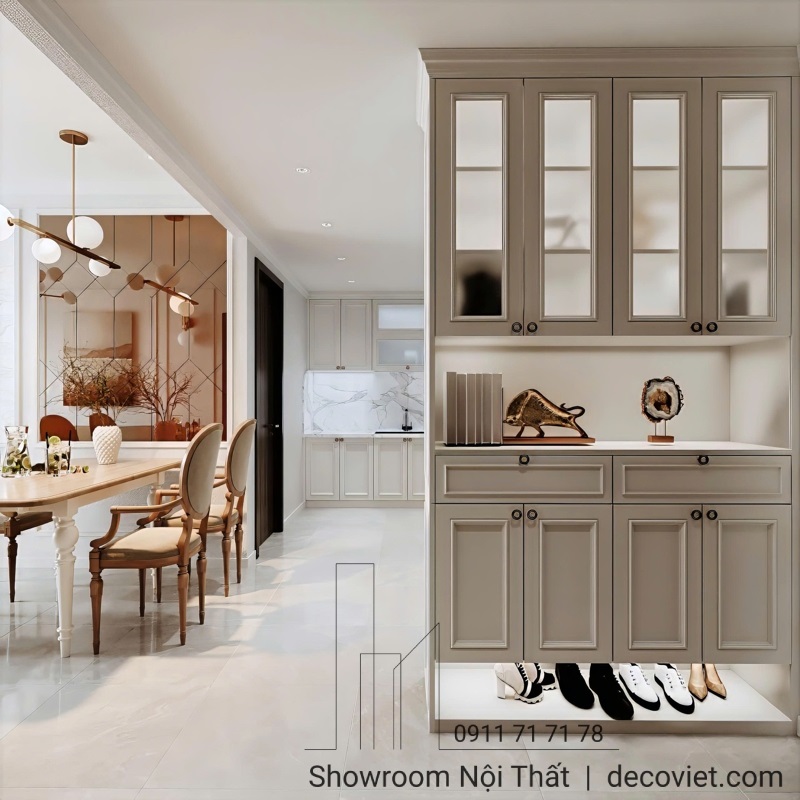 Ngay gần lối ra vào, thiết kế hệ tủ giày kết hợp tủ trang trí được bố trí gọn gàng, vừa giúp sắp xếp giày dép ngăn nắp, vừa đóng vai trò như vách ngăn nhẹ phân chia không gian bếp và bàn ăn. Tủ giày sử dụng cùng một màu sơn và thiết kế cánh như hệ bếp, tạo sự liên kết chặt chẽ về mặt thẩm mỹ.
