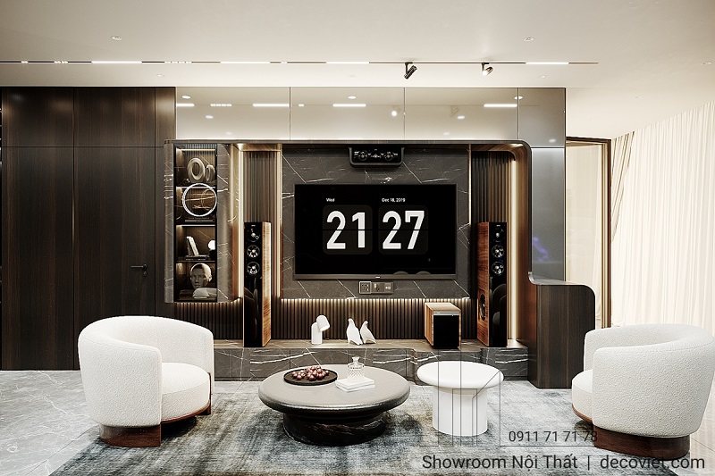 Nét cá tính của không gian được thể hiện rõ ở khu vực tường tivi, nơi được xử lý bằng vách ốp hiện đại kết hợp hệ tủ âm tường gọn gàng. Thiết kế nội thất theo phong cách này không chỉ mang đến cảm giác ngăn nắp mà còn tạo hiệu ứng chiều sâu cho toàn bộ phòng khách. Đây là điểm nhấn nổi bật, góp phần hoàn thiện diện mạo sang trọng và chỉn chu của không gian sinh hoạt chung.