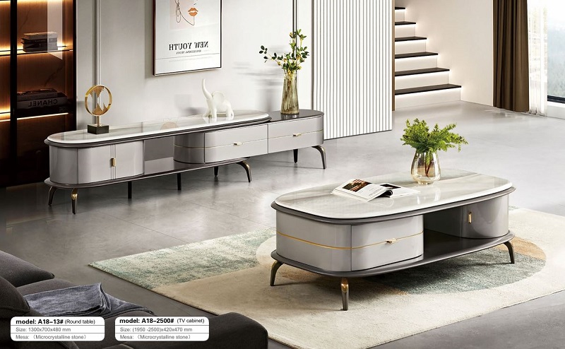 Trọn bộ kệ tivi và bàn trà nhập khẩu gây ấn tượng ngay từ cái nhìn đầu tiên nhờ thiết kế đồng bộ về màu sắc, chất liệu và kiểu dáng. Cả hai sản phẩm đều dùng chung tông màu, mặt đá vân mây sang trọng và chi tiết bo góc mềm mại, tạo nên sự hài hòa tuyệt đối khi đặt vào phòng khách. Nhờ sự đồng bộ này, không gian phòng khách trông chỉn chu hơn rất nhiều mà không cần phải đau đầu suy nghĩ cách phối từng món riêng lẻ.