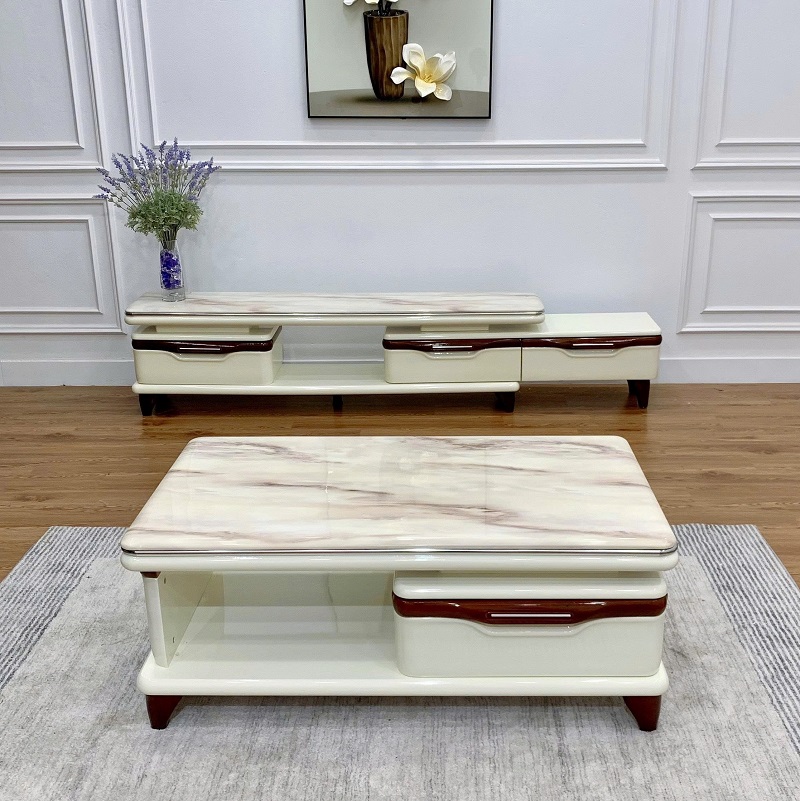Điểm đầu tiên của sản phẩm gây ấn tượng chính là thiết kế đồng bộ giữa bàn trà và kệ tivi. Cả hai đều có mặt đá vân mây sáng bóng, vừa sang vừa dễ vệ sinh. Màu trắng kem kết hợp với viền nâu gỗ tinh tế, nhìn vào là thấy sự hiện đại nhưng vẫn có chút ấm áp, gần gũi.