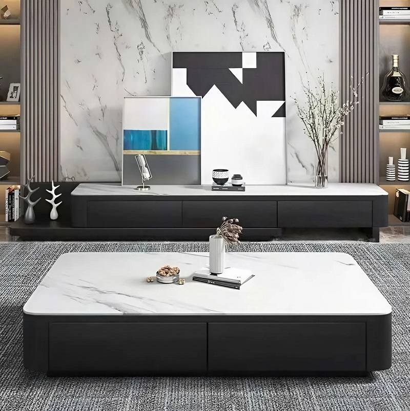 Điểm đầu tiên của sản phẩm gây ấn tượng chính là thiết kế đồng bộ giữa bàn trà và kệ tivi. Cả hai đều có mặt đá vân mây sáng bóng, vừa sang vừa dễ vệ sinh. Màu trắng kem kết hợp với màu xám thời thượng, nhìn vào là thấy sự hiện đại nhưng vẫn có chút ấm áp, gần gũi.