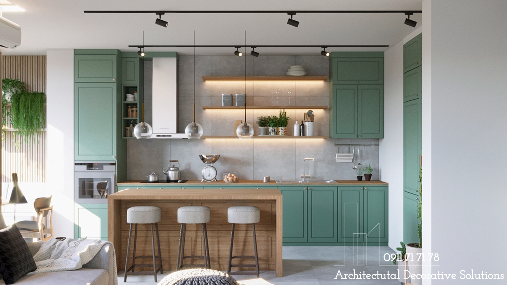 Một trong những ý tưởng thiết kế phòng bếp nhỏ hiện đại đó chính là thiết kế phòng bếp nhỏ đơn giản liên thông với phòng khách là giải pháp mang đến 1 không gian rộng rãi.
