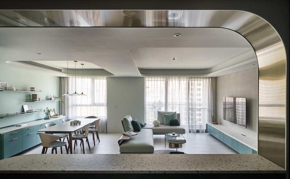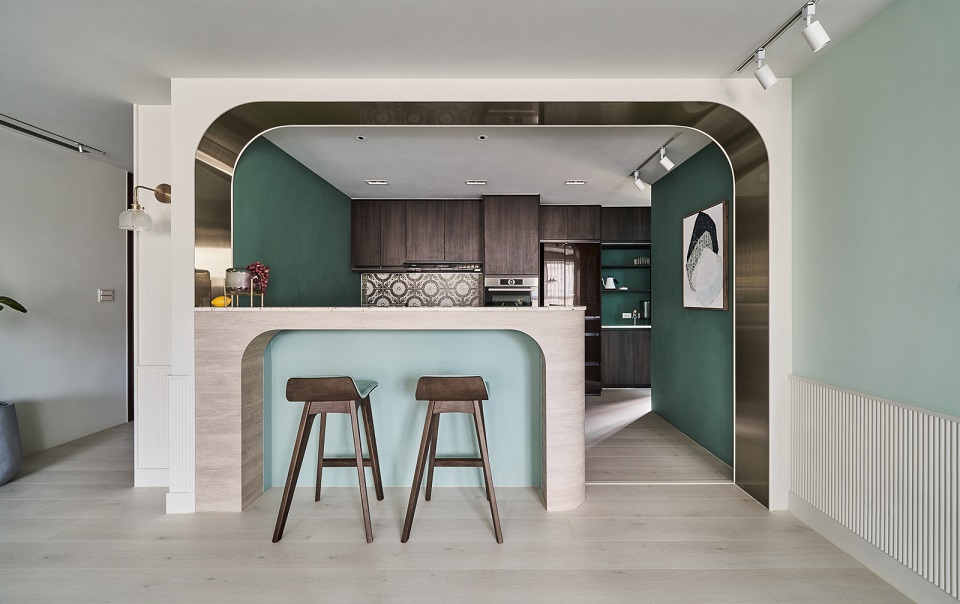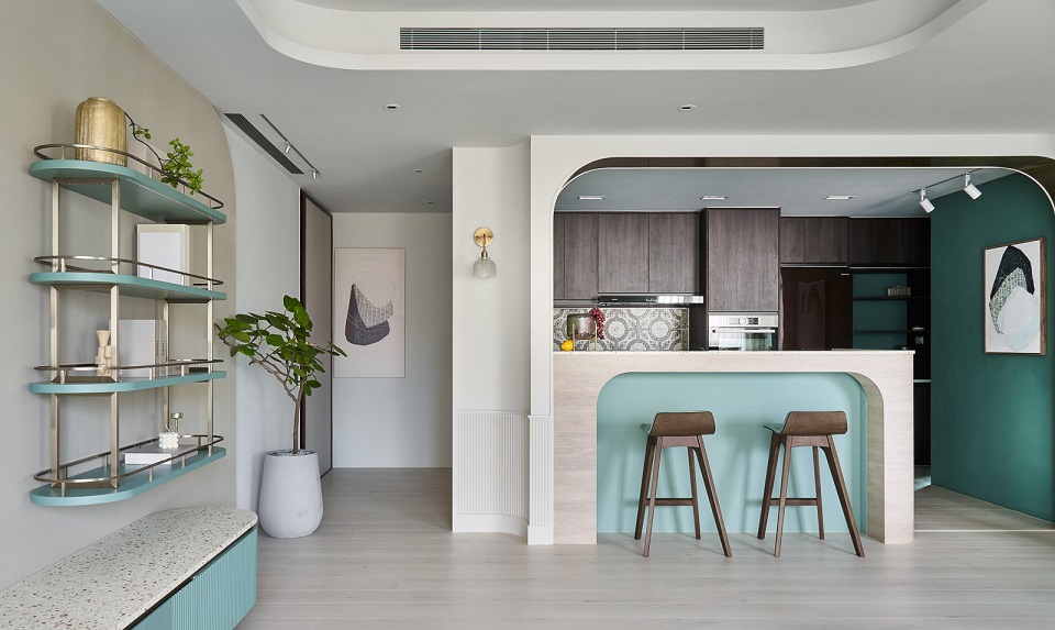 Một trong những ý tưởng thiết kế phòng bếp nhỏ hiện đại đó chính là thiết kế phòng bếp nhỏ đơn giản liên thông với phòng khách là giải pháp mang đến 1 không gian rộng rãi.