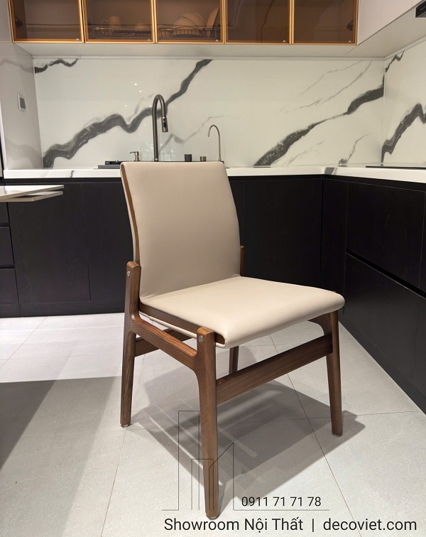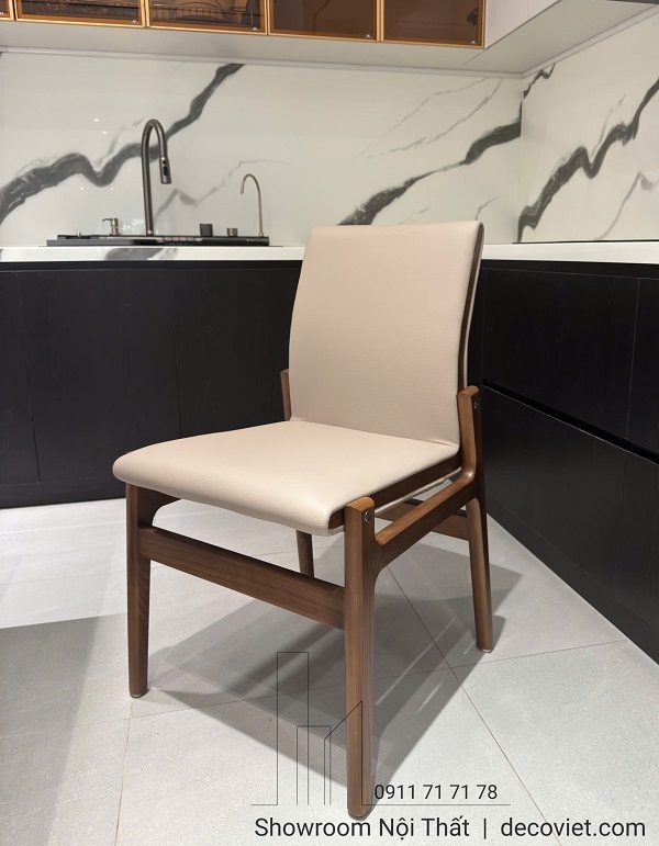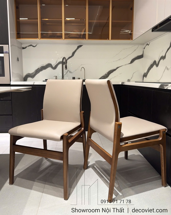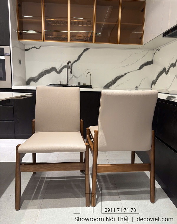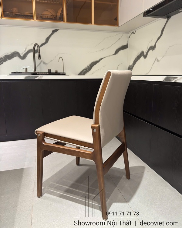 Ghế Ăn Gỗ Sồi Tự Nhiên 577S rất hợp khi đi cùng những mẫu bàn ăn gỗ hoặc bàn ăn mặt đá. Màu gỗ nâu tự nhiên của khung ghế hòa vào bàn ăn một cách nhẹ nhàng, tạo cảm giác ấm cúng nhưng vẫn sang trọng. Sự đồng điệu giữa chất liệu gỗ và tông màu kem của da bọc giúp bộ bàn ghế trở thành điểm nhấn đẹp mắt trong không gian bếp – phòng ăn.