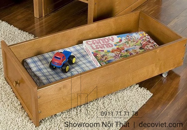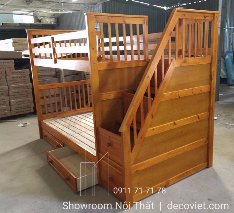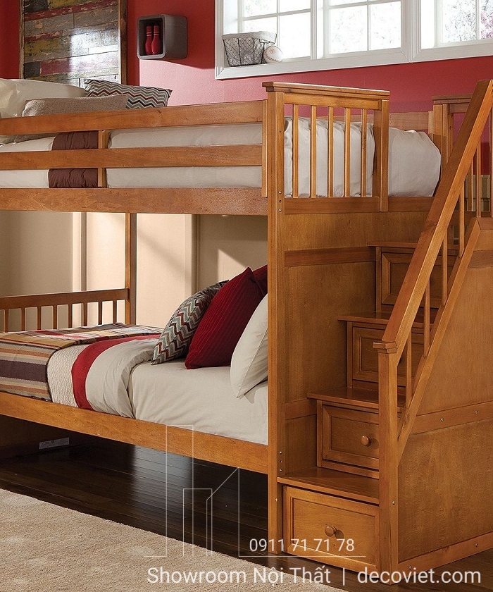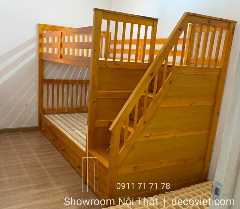 • Chiếc giường có kết cấu 2 tầng chắc chắn, làm từ chất liệu gỗ thôngcao cấp, bậc thềm đi lên thiết kế dạng khối hộp kết hợp ngăn đựng đồ tiện ích cho gia đình.