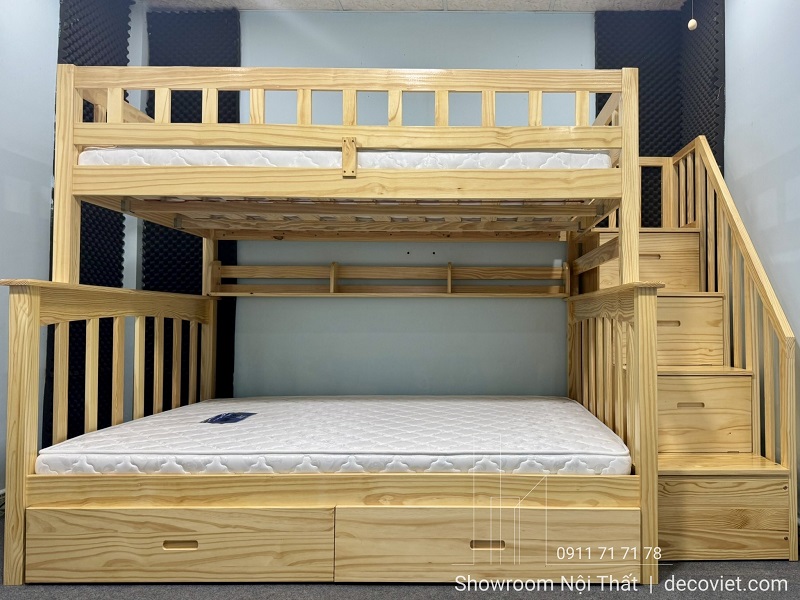 • Chiếc giường có kết cấu 2 tầng chắc chắn, làm từ chất liệu gỗ thông cao cấp, bậc thềm đi lên thiết kế dạng khối hộp kết hợp ngăn đựng đồ tiện ích cho gia đình.