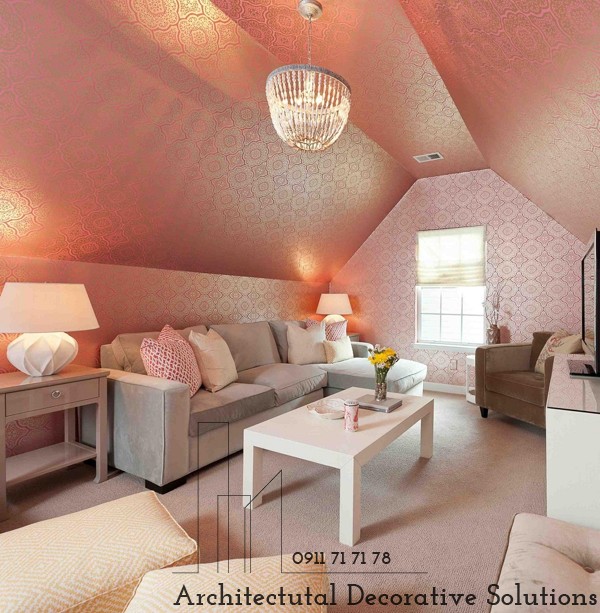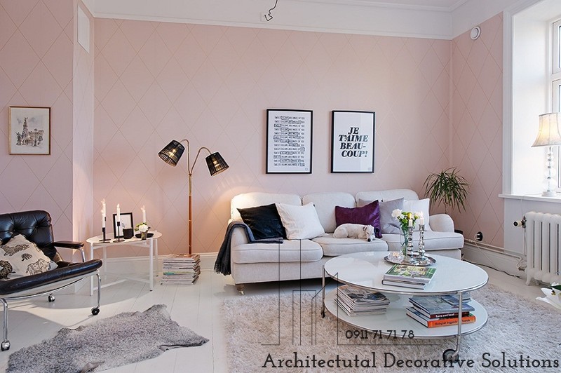 Bên cạnh sơn, bạn cũng có thể lựa chọn giấy dán tường tông hồng để trang hoàng cho phòng khách.