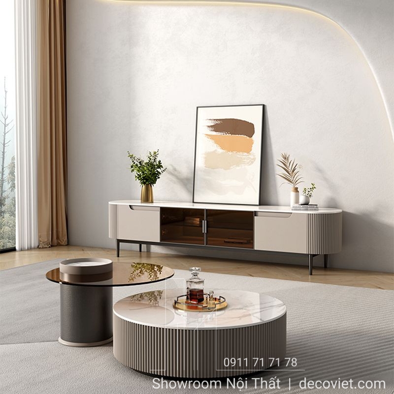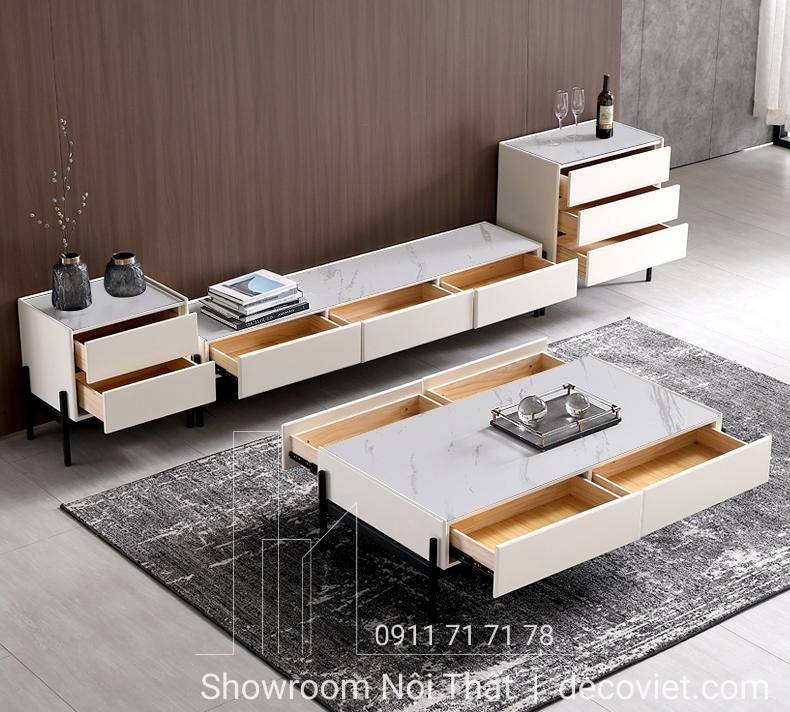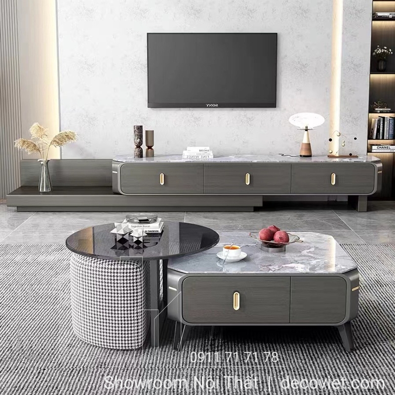 Tủ để tivi đẹp sẽ thường đi kèm với các mẫu bàn trà đẹp. Để tăng sự ấn tượng và cuốn hút cho không gian, hai món đồ nội thất này đã được thiết kế đồng bộ về kiểu dáng, màu sắc, vân đá để tạo nên vẻ đẹp hài hòa, sang trọng, tăng tính thẩm mỹ cho không gian. BST Combo bàn kệ phòng khách đẹp hiện đại được DecoViet ra mắt hoàn toàn mới, cung cấp cho khách hàng đa dạng sự lựa chọn với các mẫu mã, phù hợp với mọi phòng khách chung cư, nhà phố cho tất cả các biệt thự bề thế, sang trọng.