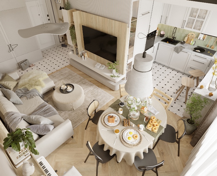 Không gian mở chính là nét đặc trưng của các phong cách thiết kế nội thất hiện đại. Khi nhìn vào, sẽ rất khó bắt gặp một sự bố trí chỉn chu, gò bó mà thay vào đó bạn sẽ thấy các vật dụng được sắp xếp tự do, bất đối xứng. Cụ thể, các kiến trúc sư thường kết hợp các phòng với nhau tạo thành không gian chung, thường là phòng khách và phòng bếp. Việc kết hợp này rất thích hợp cho những không gian có diện tích hạn chế, tạo cảm giác thoáng đãng, tự do.
