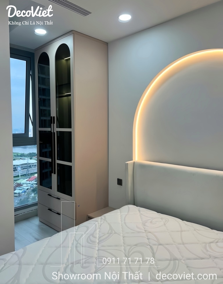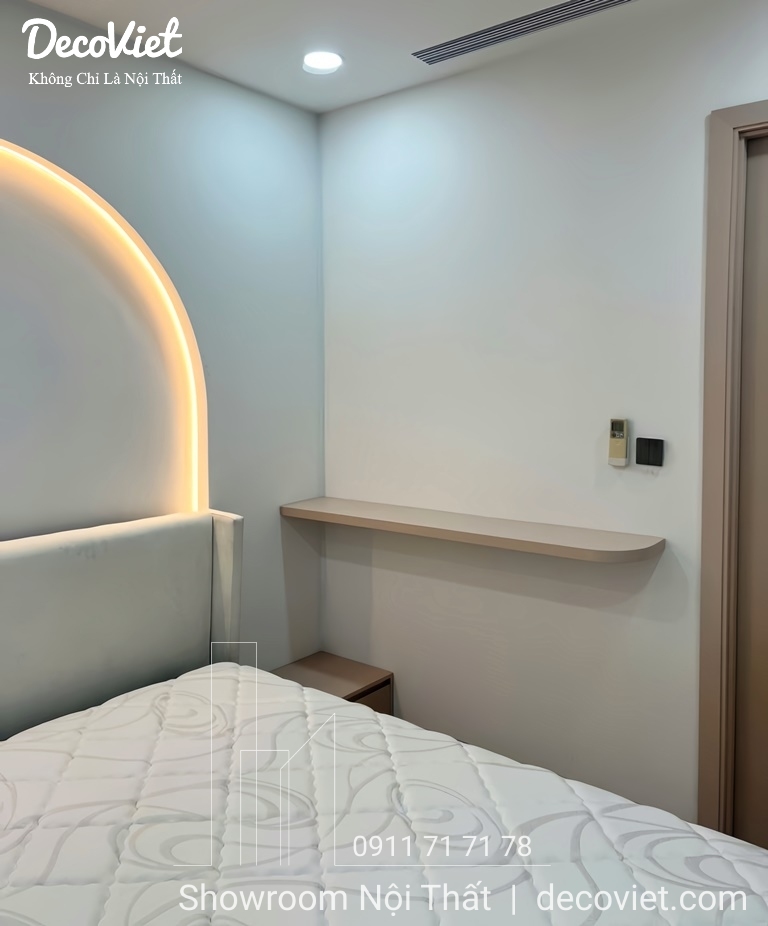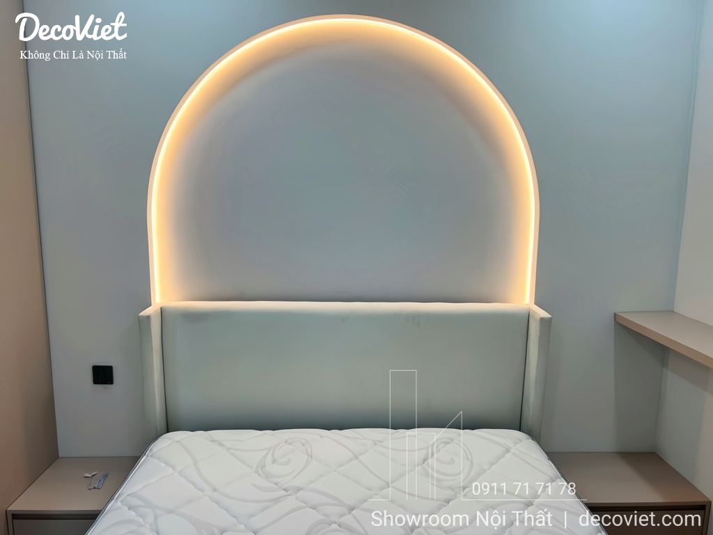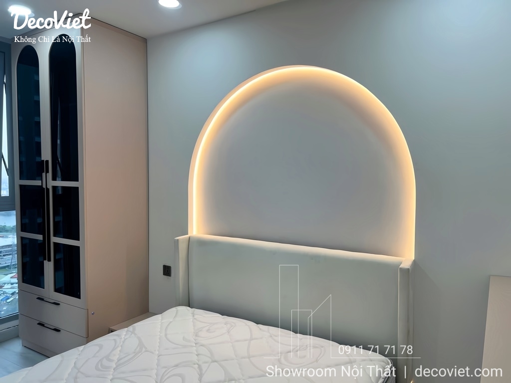 Các chi tiết trang trí như đèn led âm tường ở đầu giường tạo điểm nhấn và giúp không gian trở nên sinh động hơn. Ánh sáng trong phòng được thiết kế đầy đủ, tạo sự thông thoáng và dễ chịu khi trở về phòng ngủ để nghỉ ngơi và thư giãn.