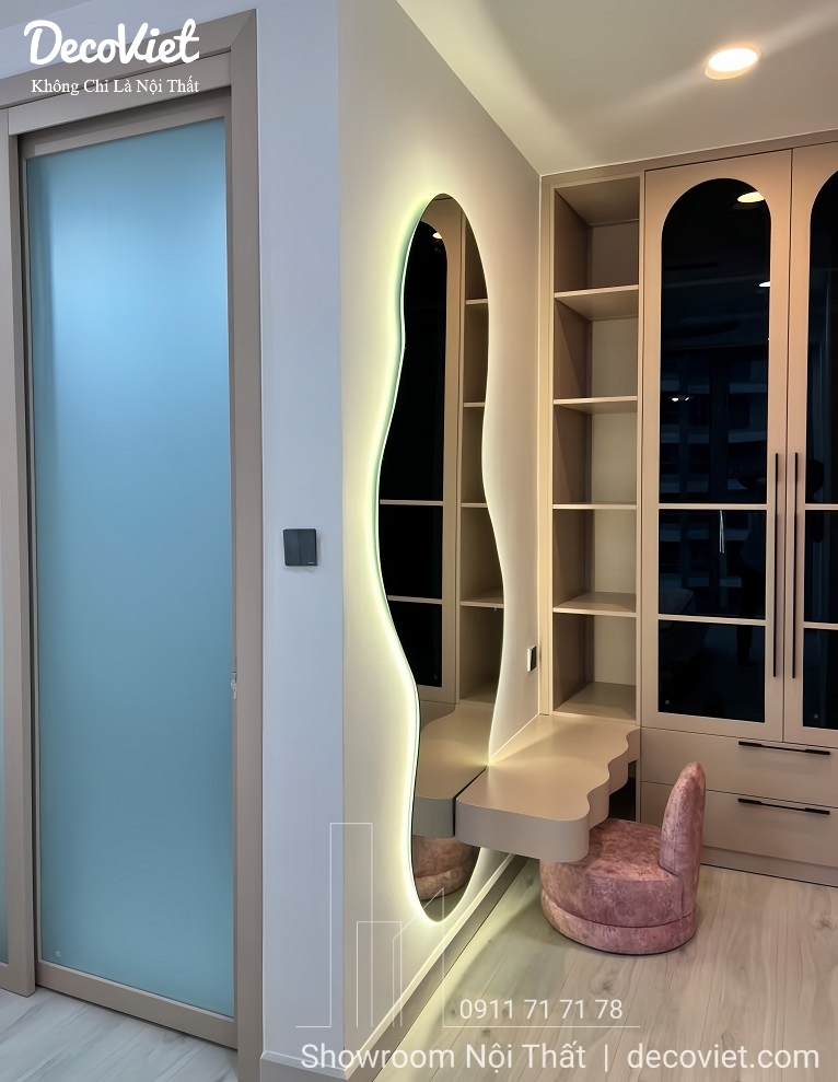Chiếc gương lớn được bố trí trên tường cùng hệ đèn led giúp không gian thay đồ thêm lung linh. Bàn trang điểm ngồi bệt giúp tiết kiệm không gian tối đa, tạo sự tiện nghi và đẹp mắt cho không gian sống.