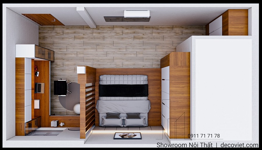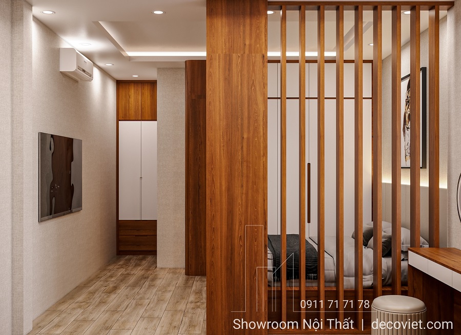 Vách gỗ phân chia khu vực giường ngủ và bàn làm việc, vừa mang tính thẩm mỹ vừa tăng tính riêng tư.
