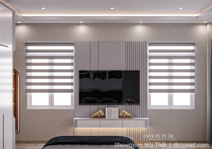 Tivi treo tường đặt đối diện giường, vừa đáp ứng nhu cầu giải trí vừa giúp không gian thêm tiện nghi, đẳng cấp.