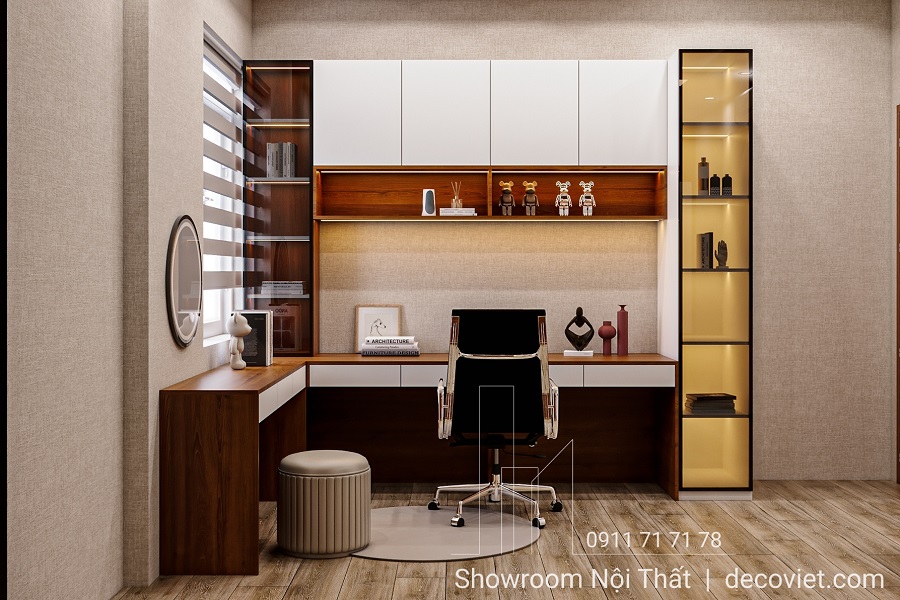 Bàn học – bàn làm việc thiết kế chữ L, vừa tiết kiệm diện tích vừa mang đến sự tiện lợi trong sinh hoạt và học tập.