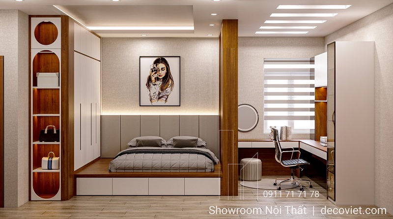 Giường đặt trên bục gỗ nâng, vừa tạo điểm nhấn kiến trúc vừa tối ưu thêm không gian lưu trữ phía dưới.
