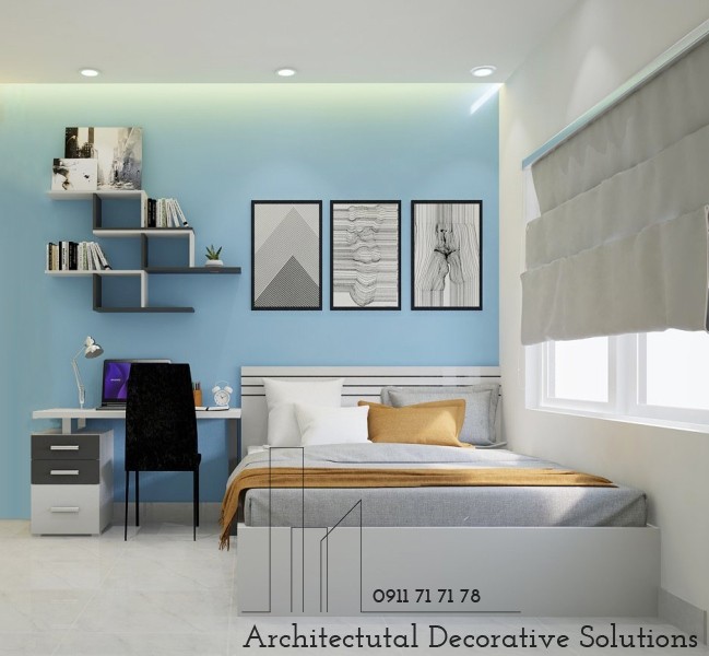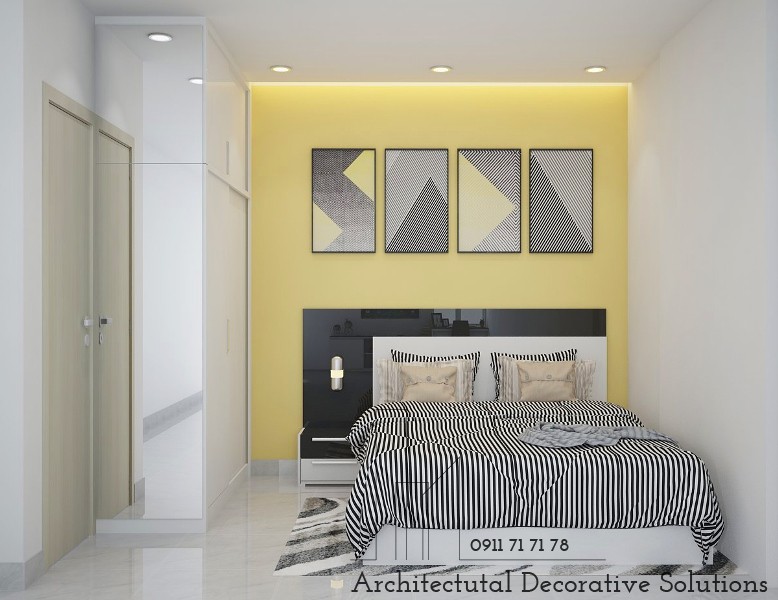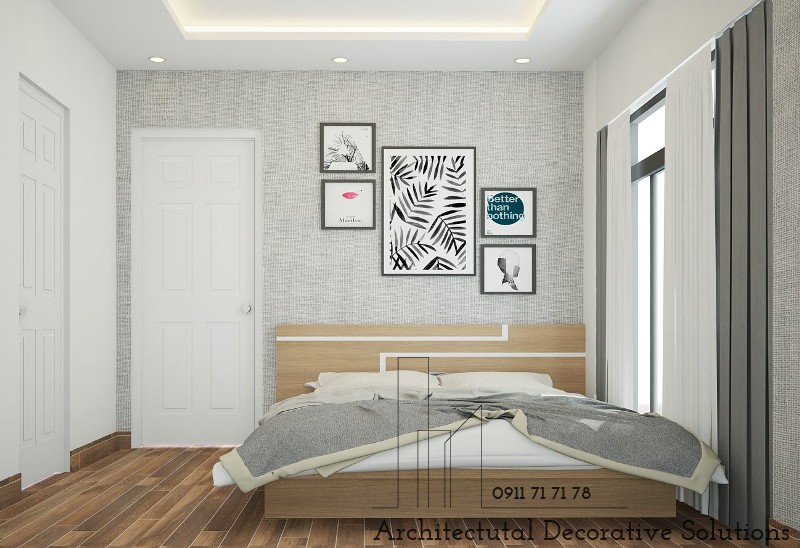 Cũng với xu hướng đơn giản, phòng ngủ hiện đại với tông màu trắng. Một chút họa tiết với trên giấy dán tường tạo cảm giác cho chốn nghỉ ngơi rất thanh thoát