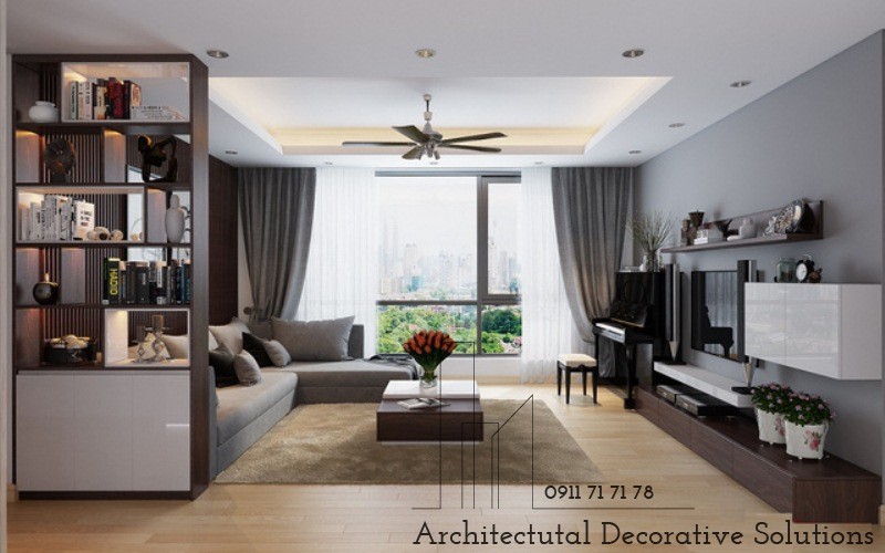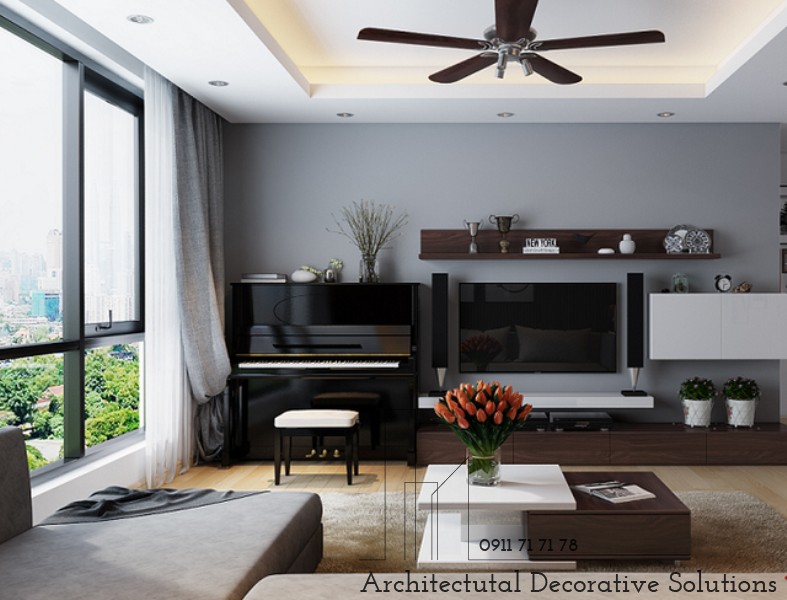 Đây là thiết kế của một căn hộ cho thuê. Phòng khách được thiết kế theo phong cách hiện đại, sang trọng với gam màu chính là màu xám xanh