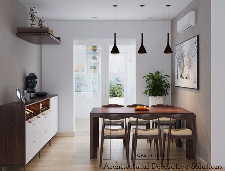 Khu bàn ăn nhà phòng khách được thiết kế liên tiếp nhau để tiết kiệm diện tích. Bộ bàn ăn bằng gỗ nâu hòa hợp với sàn gỗ tạo nên nét đồng điệu rất riêng cho căn hộ