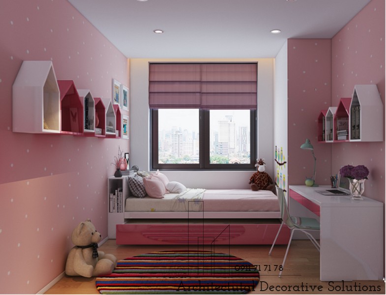 Phòng ngủ cho bé gái là sắc hồng rực rỡ được bố trí rất gọn gàng, giường thông minh có ngăn ở dưới cho bé thỏa sức cắt đồ