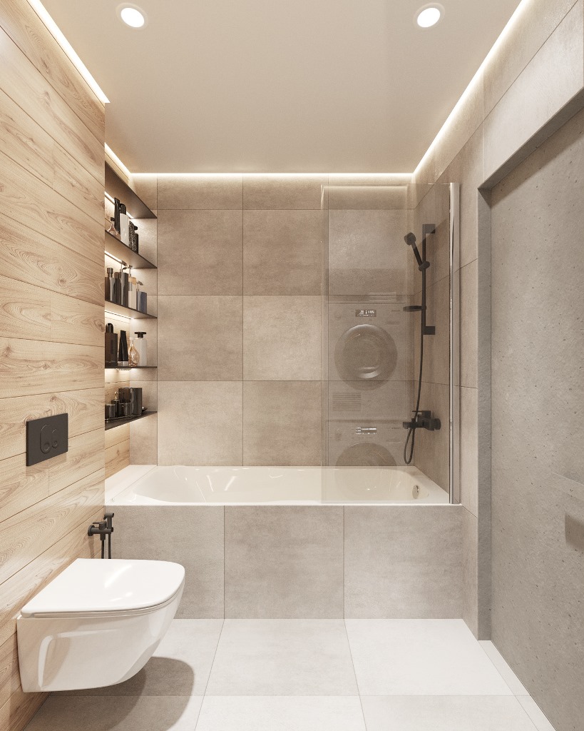 Khu vực phòng tắm được lựa chọn sàn màu ghi, gạch màu trắng với các thiết bị cần thiết. Các khu vực chức năng phân chia hợp lý tăng thêm sự thoải mái và dễ chịu cho mọi người khi sử dụng.