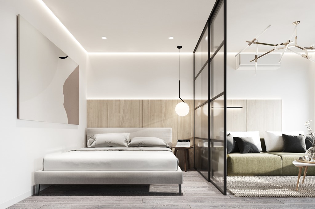 Không gian nghỉ ngơi được tách biệt riêng tư. Căn phòng cần nhiều đến sự yên tĩnh nên một lần nữa, màu ghi được lựa chọn để trang trí, tạo phông nền cho căn phòng ngủ. Không gian được bố trí nội thất màu trắng và be để tạo nên góc nhỏ ấm cúng, nền nã.