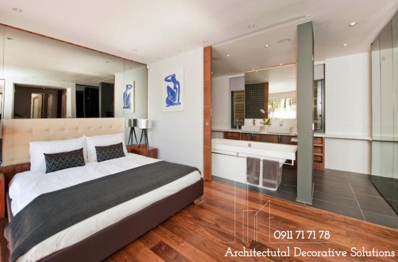 Lắp bồn tắm và phòng ngủ đôi khi chiếm rất nhiều diện tích trong căn hộ của bạn. Nhưng việc từ bỏ cảm giác thoải mái khi ngâm mình trong đó khiến bạn không thể đưa ra quyết định dứt khoát. Vậy tại sao không thử một cách làm mới vừa hiệu quả lại có thể đáp ứng nhu cầu dễ chiều này của bạn. Một số nhà thiết kế đã đặt bồn tắm ngay trong phòng ngủ. Bạn sẽ tự hỏi liệu cách làm này có khiến mỹ quan trong phòng bị phá vỡ và cảm giác như mình đang ngủ trong phòng tắm. Câu trả lời là không. Ngược lại, cách làm này còn mang tới sự thoải mái và tự do ngay chính không gian riêng tư thuộc về mình.