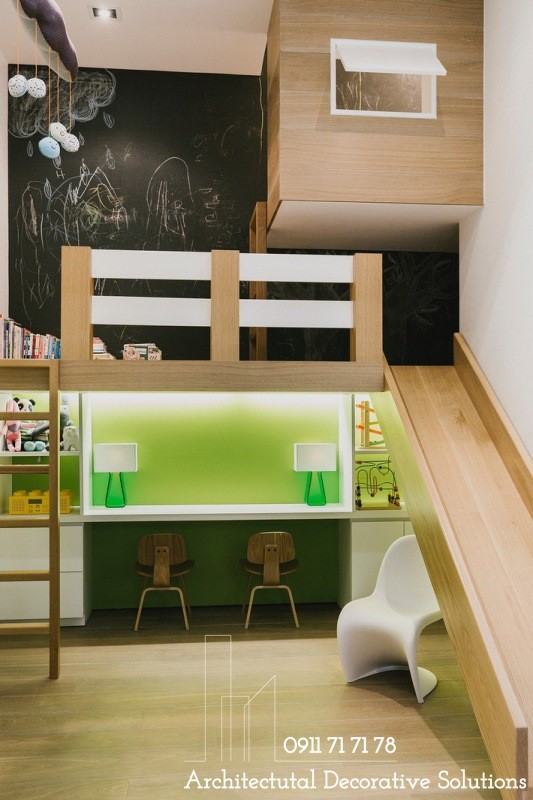 Thiết kế sáng tạo này kết hợp một khu vui chơi bổ ích với bàn học.