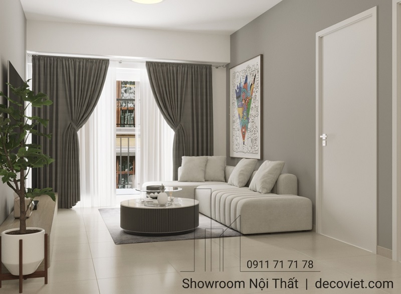 Phòng khách được thiết kế với tông màu trung tính chủ đạo, mang lại cảm giác nhẹ nhàng và thư thái. Được bố trí các nội thất như sofa, bàn trà và kệ tivi được chọn lựa kỹ lưỡng, phù hợp với diện tích nhỏ gọn của căn hộ. Điểm nhấn là ánh sáng tự nhiên, tận dụng tối đa từ cửa sổ lớn, giúp không gian luôn thông thoáng và tràn đầy sức sống.