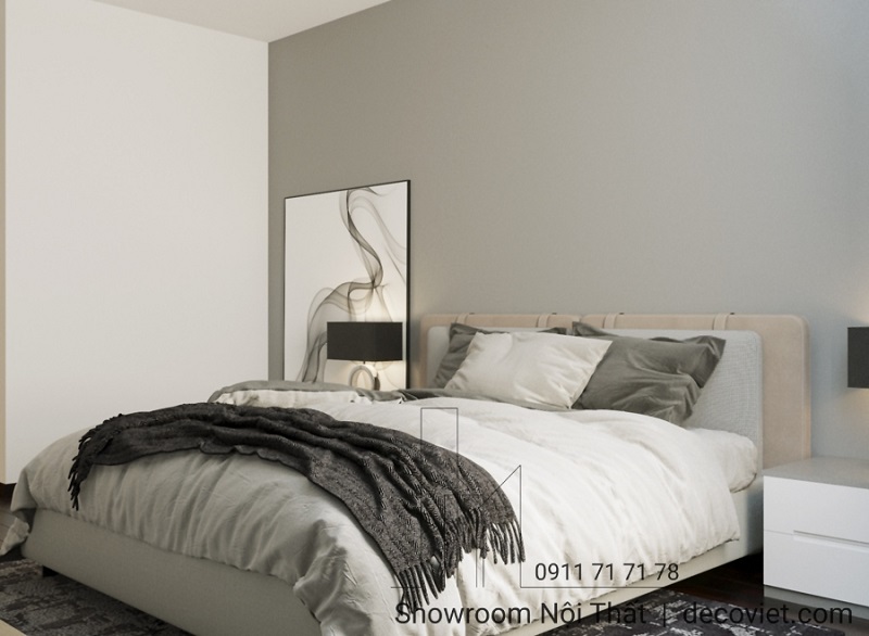 Giường ngủ chiếm vị trí trung tâm, trở thành tâm điểm của không gian phòng ngủ mang phong cách hiện đại. Hai bên được bố trí khéo léo với tab đầu giường nhỏ gọn, sự kết hợp hài hòa này không chỉ tôn lên vẻ đẹp tinh tế của căn phòng mà còn mang lại sự tiện nghi tối đa, tạo cảm giác thoải mái và thư giãn cho gia chủ.