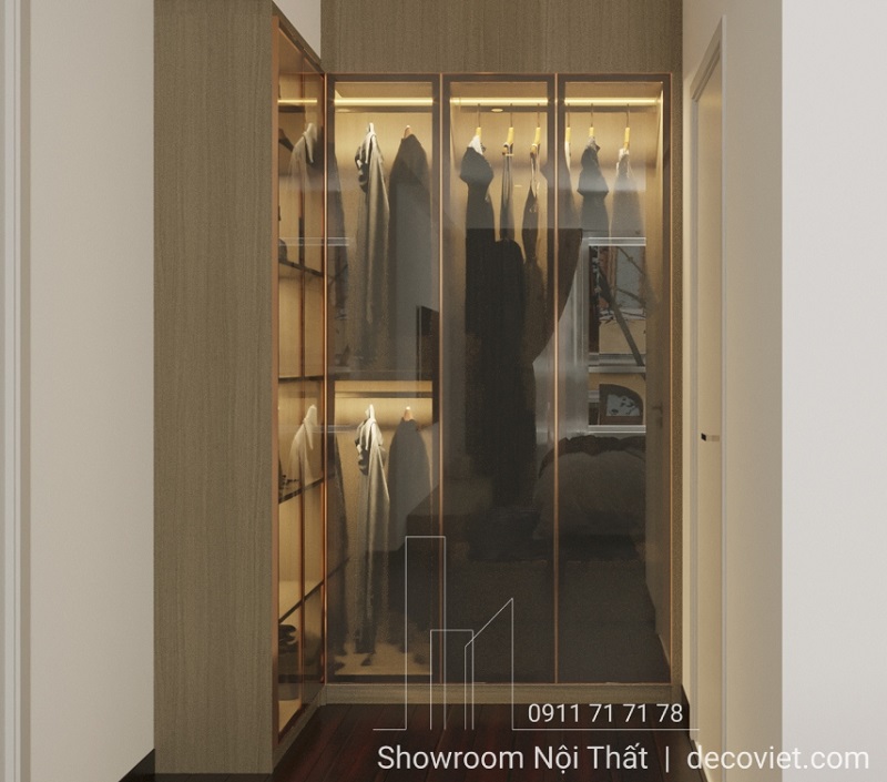 Sự kết hợp hoàn hảo giữa cửa kính và đèn LED không chỉ tăng tính thẩm mỹ mà còn làm nổi bật nét độc đáo của thiết kế, biến tủ quần áo thành một điểm nhấn đầy ấn tượng.