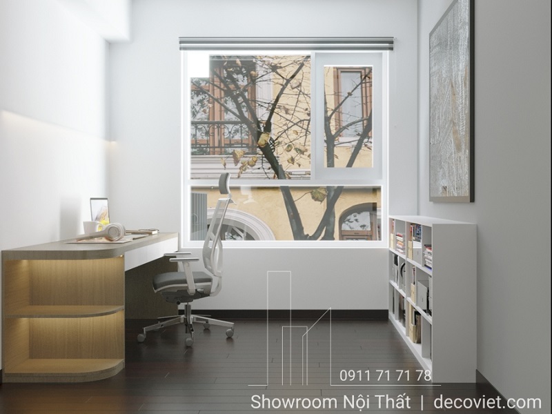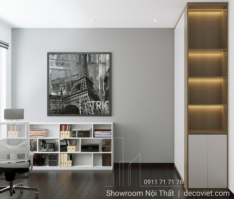 Thiết kế tủ sách màu trắng được bố trí bên phải căn phòng, với thiết kế các ngăn mở để tối ưu hóa không gian lưu trữ. Đây là nơi lý tưởng để sắp xếp tài liệu, sách hoặc những món đồ trang trí nhỏ gọn, giúp không gian làm việc luôn gọn gàng và sạch sẽ.