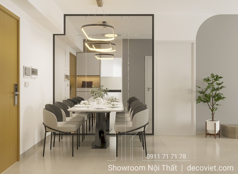 Bộ bàn ăn mặt đá 8 ghế được đặt ngay trung tâm trở thành tâm điểm của không gian, mang đậm dấu ấn hiện đại và tinh tế. Với kiểu dáng tối giản, mặt bàn đá sáng bóng tạo hiệu ứng phản chiếu ánh sáng nhẹ nhàng, làm bừng sáng cả khu vực xung quanh. Sự kết hợp cùng ghế ăn bọc nệm tối màu không chỉ mang lại cảm giác êm ái mà còn tạo nên sự đối lập đầy cuốn hút, cân bằng giữa sự mềm mại và mạnh mẽ.
