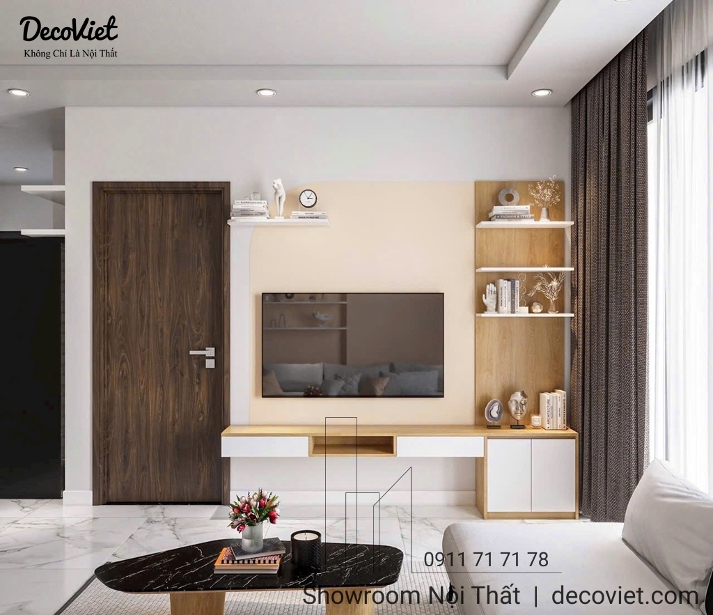 Ngoài bộ ghế sofa và bàn trà mặt đá, thì kệ tủ tivi gỗ treo là món đồ nội thất trang trí không thể thiếu. Sử dụng gam màu vàng tự nhiên của gỗ công nghiệp cùng lớp sơn màu trắng thanh lịch mang đến nét đẹp trẻ trung và phóng khoáng.