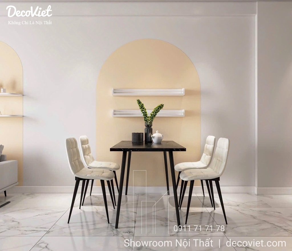 Bộ bàn ăn 4 ghế nhỏ gọn hướng đến sự đơn giản, không cầu kỳ. Đặc biệt, bàn ăn mặt đá chính là biểu tượng đặc trưng mang đến sự sang trọng và tinh tế cho phong cách thiết kế hiện đại, tạo nên sự trẻ trung và sức sống mới cho không gian sống của gia chủ.