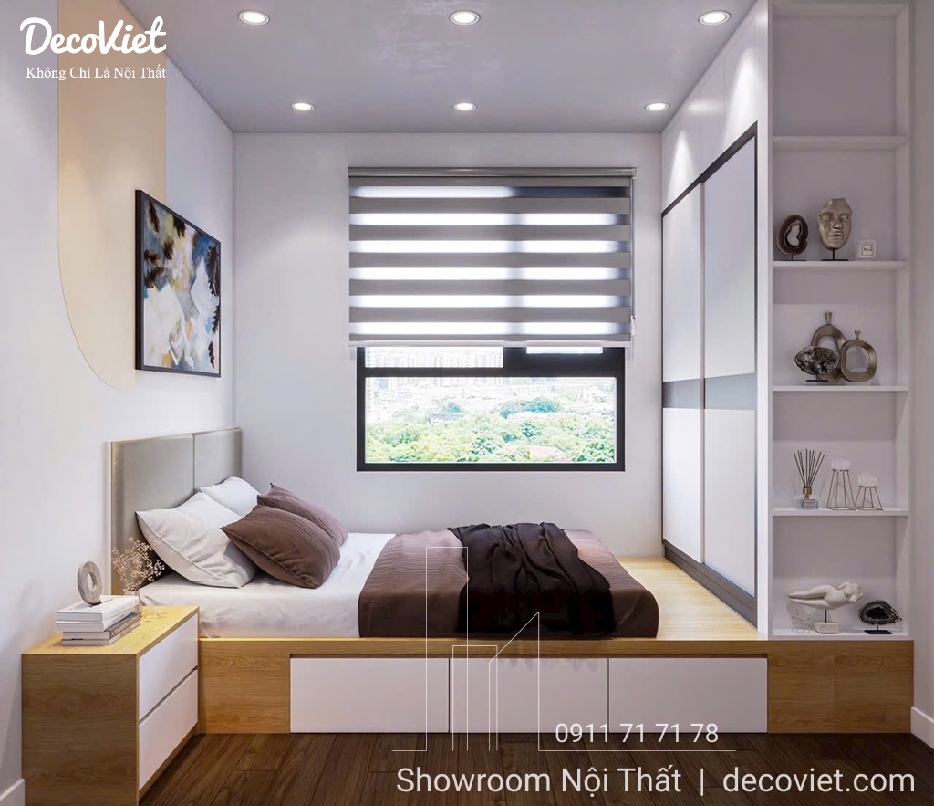 Bởi diện tích phòng ngủ không quá lớn nên tất cả nội thất đều được các KTS của DecoViet tính toán kích thước tỉ mỉ, nhằm mở rộng tiện ích sử dụng mà vẫn đảm bảo được “tầm nhìn” rộng thoáng. Cửa số lớn giúp đón ánh nắng tự nhiên ngập tràn, giúp căn phòng thêm thông thoáng và mát mẻ hơn.