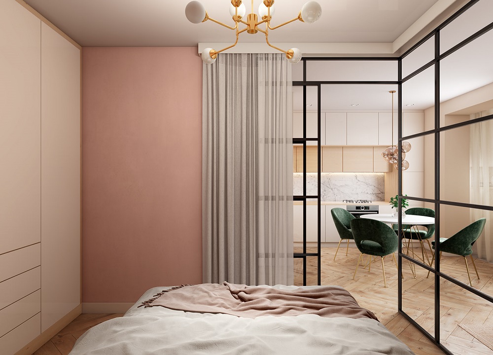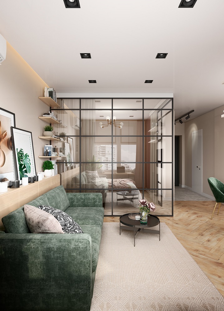 Với chung cư có diện tích khiêm tốn, cách bài trí này không hề làm ảnh hưởng đến không gian hai khu vực phòng khách và phòng ngủ nhờ sự khéo léo của KTS khi vách ngăn độc đáo. Với chất liệu kính trong suốt sẽ làm cho không gian thêm rộng rãi và không hề bí bách.