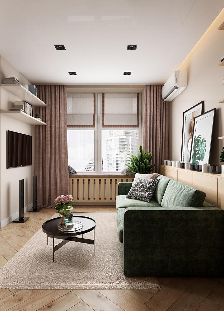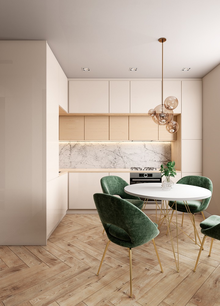 Căn hộ chung cư sử dụng tone màu xanh lá kết hợp với màu của gỗ nhằm mang lại cảm giác sạch sẽ, thoáng đãng và gần gũi hơn, đồng thời giúp dễ dàng bài trí các món đồ nội thất khác nhau.
