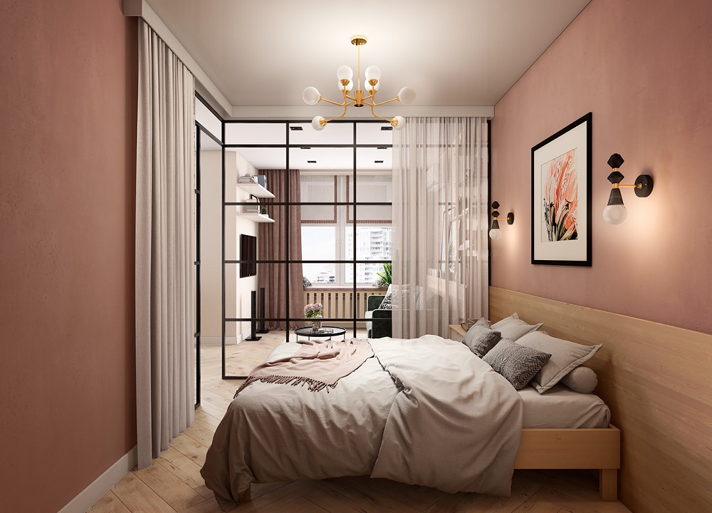 Phòng ngủ được ngăn cách với khu vực sinh hoạt bằng một chiếc vách ngăn trong suốt kết hợp với rèm thay vì xây tường kín. Đây được xem là cách làm khá sáng tạo để không gian không bị thu hẹp mà vẫn đảm bảo sự riêng tư khi sống trong căn hộ 40m2 này.