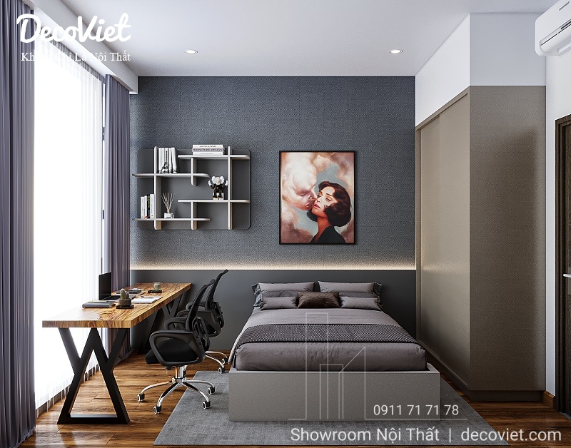 Các đường nét thẳng khỏe khoắn và dứt khoát của các món đồ nội thất như giường ngủ, bàn làm việc, tủ quần áo, kệ trang trí đã tạo nên một không gian phòng ngủ đẹp, gọn gàng và lôi cuốn.