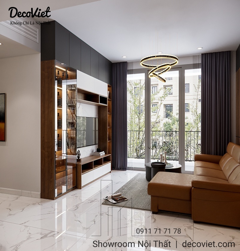Từ kệ tivi gỗ đến tủ rượu trang trí, cửa sổ sát đất đều là những hình khối hình học hiện đại và mạnh mẽ. Thiết kế nội thất chung cư đẹp với cách phối màu sắc với chất liệu sử dụng là gỗ công nghiệp cũng là điểm nhấn nổi bật để chứng tỏ gu thẩm mỹ cũng như đẳng cấp của gia chủ.