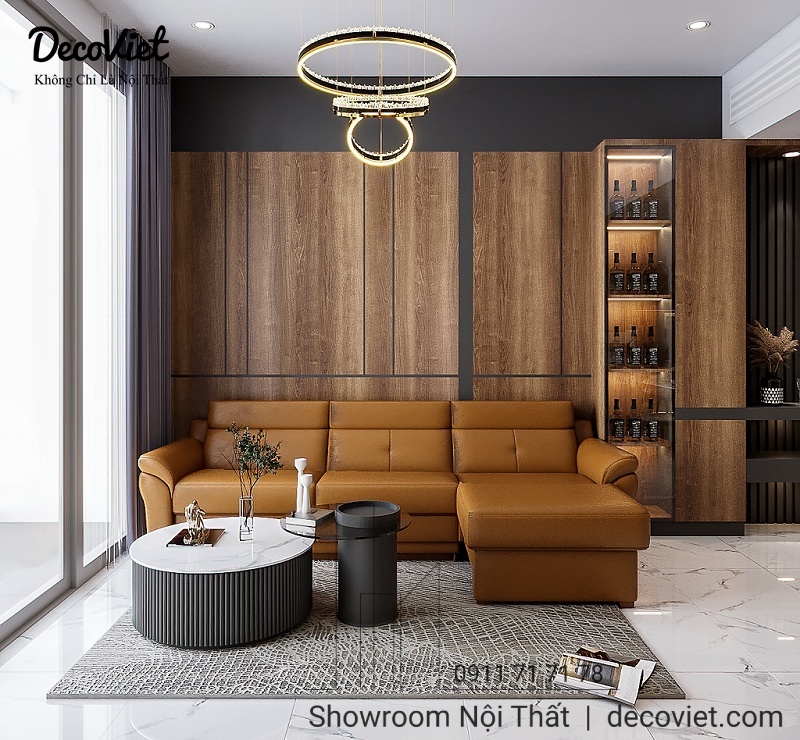 Các kiến trúc sư của DecoViet đã lựa chọn bộ ghế sofa da màu cam nổi bật kết hợp cùng bàn trà tròn đôi mặt đá + kính hiện đại. Đường nét khỏe khoắn của ghế sofa cùng sự mềm mại của bàn trà tròn sẽ giúp dung hòa giữa sự mạnh mẽ và dịu dàng, tạo nên một tổng thể phòng khách thống nhất và hài hòa.