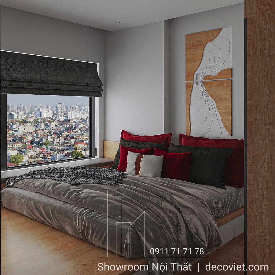 Bên cạnh giường chính là cửa sổ lớn mở ra góc nhìn thoáng đãng, tận dụng ánh sáng tự nhiên để làm bừng sáng cả căn phòng, tạo cảm giác rộng rãi và thoải mái. Ánh sáng dịu nhẹ buổi sớm chiếu vào không gian nghỉ ngơi, giúp bắt đầu ngày mới đầy năng lượng. Vào buổi tối, cửa sổ lớn này cũng mang lại trải nghiệm yên bình, giúp người trong phòng dễ dàng tận hưởng khoảnh khắc tĩnh lặng, tạo nên không gian lý tưởng cho giấc ngủ sâu và thư giãn.