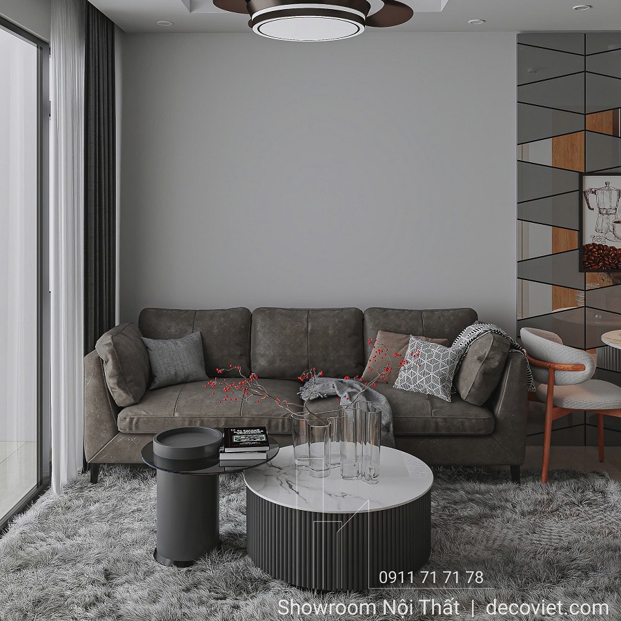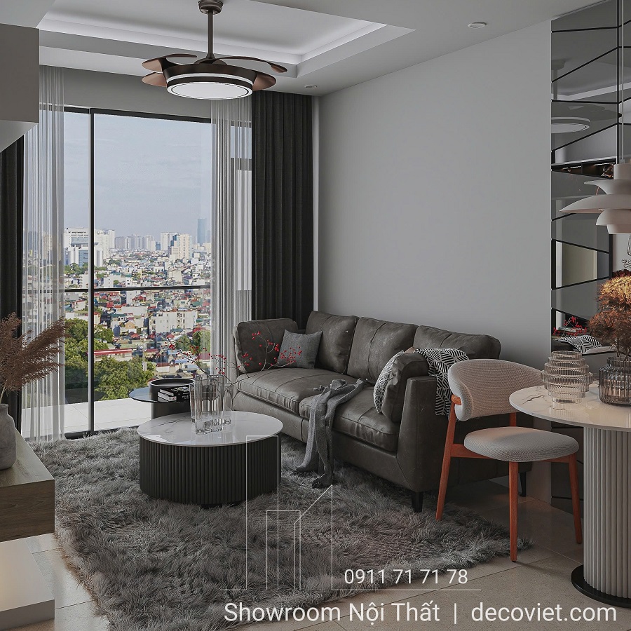 Nổi bật trong dự án Thiết Kế Nội Thất Căn Hộ New City Thủ Thiêm 2PN chính là thiết kế không gian phòng khách kết hợp tấm thảm lông màu xám mềm mại trải dài, mang đến sự ấm áp và sang trọng, kết hợp hoàn hảo với bộ ghế sofa băng xám đậm có những chiếc gối trang trí nhỏ, tạo điểm nhấn thanh lịch, giúp góc phòng trở nên gần gũi, thoải mái. Không gian tiếp khách không thể nào thiếu mẫu bàn trà tròn mặt bàn đá được đặt ở trung tâm làm tổng thể không gian hài hòa nhẹ nhàng. Bên cạnh là cửa sổ lớn mở ra khung cảnh thành phố nhộn nhịp, cho phép ánh sáng tự nhiên tràn ngập, làm sáng bừng không gian. Tone màu trung tính kết hợp giữa đen, trắng và xám tạo nên một không gian sống vừa sang trọng vừa thư thái, lý tưởng để thư giãn và tận hưởng những khoảnh khắc yên bình.